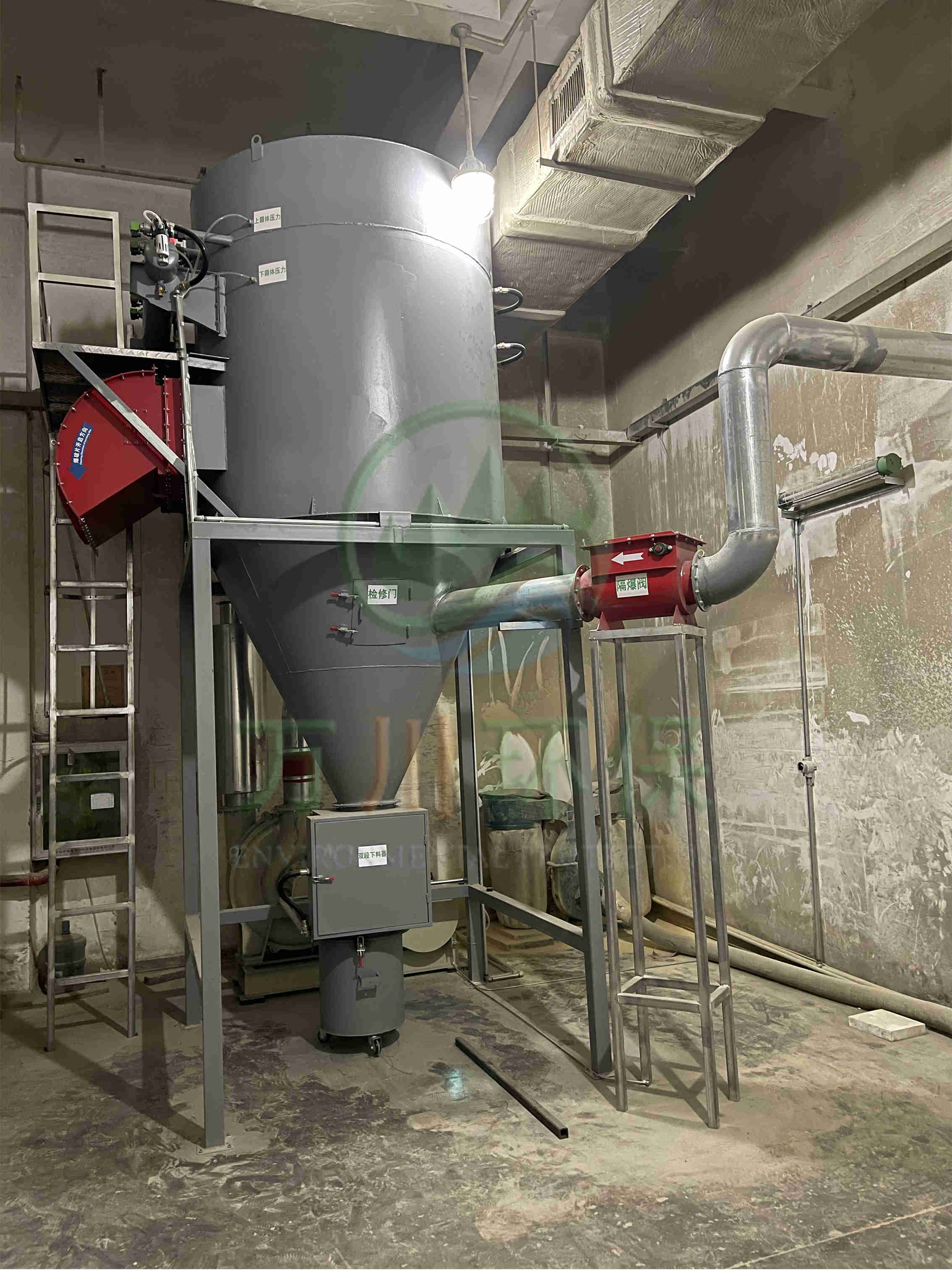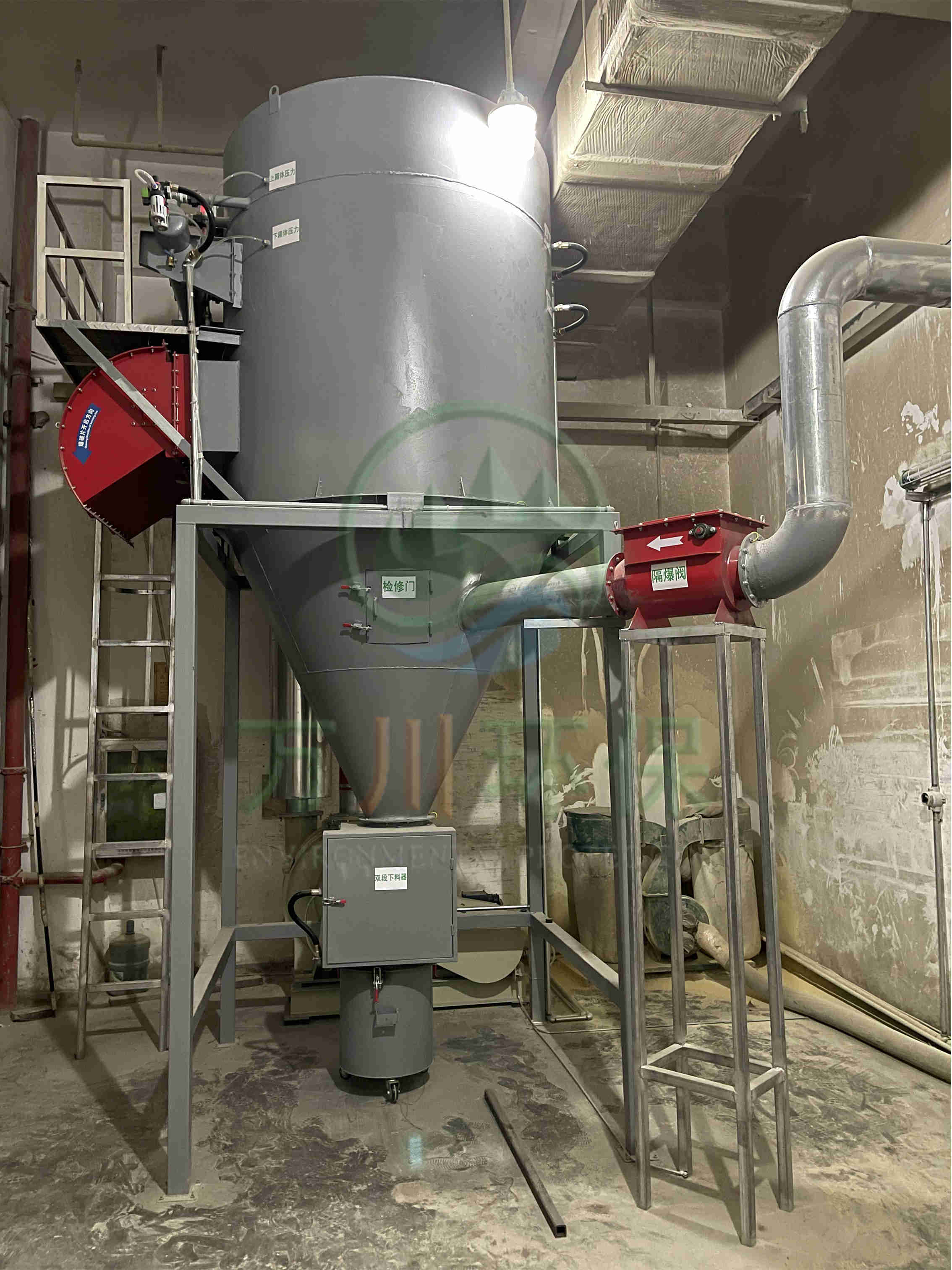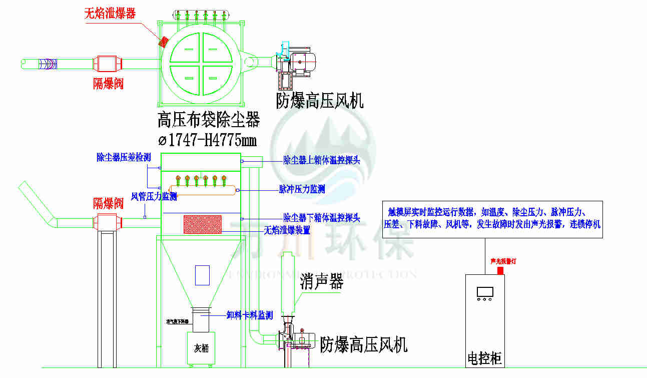 萬川配套一套脈沖布袋除塵器+防靜電布袋+防爆除塵風(fēng)機+防爆卸料器+無焰泄爆器+隔爆+自動化電控柜系統(tǒng)。