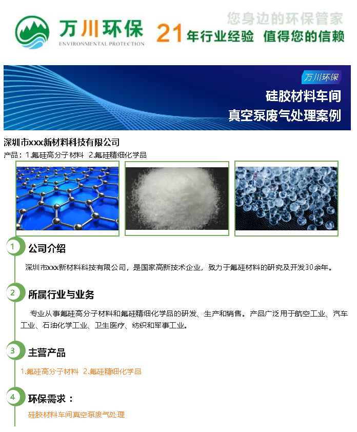 簡(jiǎn)介: 深圳市xxx新材料科技有限公司,是國(guó)家高新技術(shù)企業(yè),致力于氟硅材料的研究及開(kāi)發(fā)30余年。萬(wàn)川環(huán)保受邀對(duì)硅膠材料加工車(chē)間真空泵廢氣進(jìn)行處理。本文介紹了硅膠材料真空泵廢氣處理中說(shuō)使用的設(shè)備與方案。